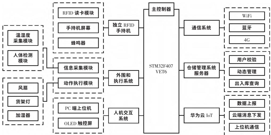 主控系统基于FreeRTOS运行,优化多任务调度和内存动态分配[8],用于接收并转发来自手持设备的RFID读卡信息,处理显示和控制逻辑(温湿度、仓储信息和货架灯、风扇、加湿器)。手持设备处理高频RFID盘存信息,并经蓝牙传至主控系统。云端平台接收仓储数据并存储,同时提供外部接口实现数据双向交互。