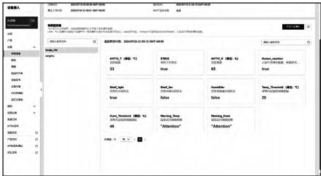 测试结果表明,RFID读卡器可以完成单个或批量货物的出入库,且在操作完成后发出提示声音;PC端桌面应用与华为云平台、主控终端三者之间能够始终保持同步,即任一终端的数据修改均能在另二者上同步更新。图11为华为云物联网平台界面